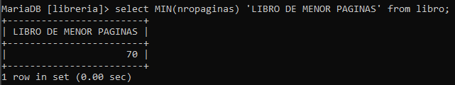 >>> select MIN(nropaginas) 'LIBRO DE MENOR PAGINAS' from libro;